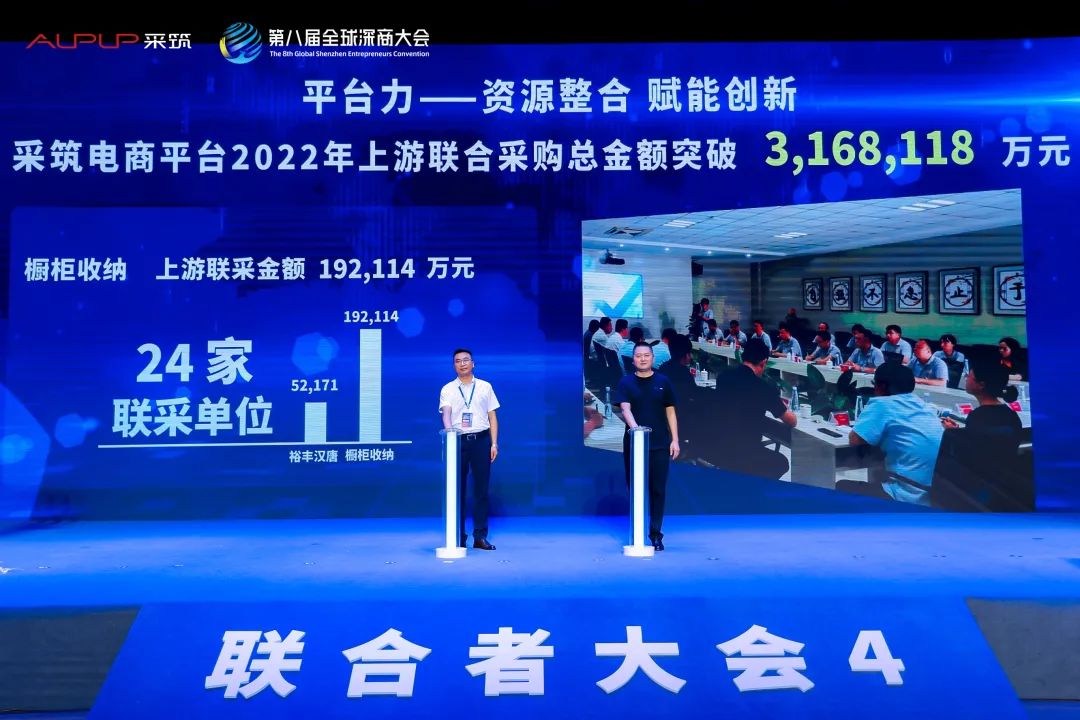 2022年7月5日下午,“4力破局 逆勢增長”第八屆全球深商大會暨采筑聯(lián)合者大會”在深圳濱海藝術中心多功能廳隆重啟幕。采筑攜手深商會,集結行業(yè)內數百位企業(yè)家,深入探討如何通過疊加生態(tài)力、產品力、平臺力和設計力,優(yōu)化升級供應鏈,提高行業(yè)采購效率,推動行業(yè)綠色升級,助力企業(yè)全面逆勢破局。來自400多家企業(yè)的企業(yè)家、聯(lián)合者們再度相聚于聯(lián)合者大會,青島裕豐漢唐木業(yè)有限公司總經理馬春偉、研發(fā)中心總監(jiān)高玉良受邀參會。
