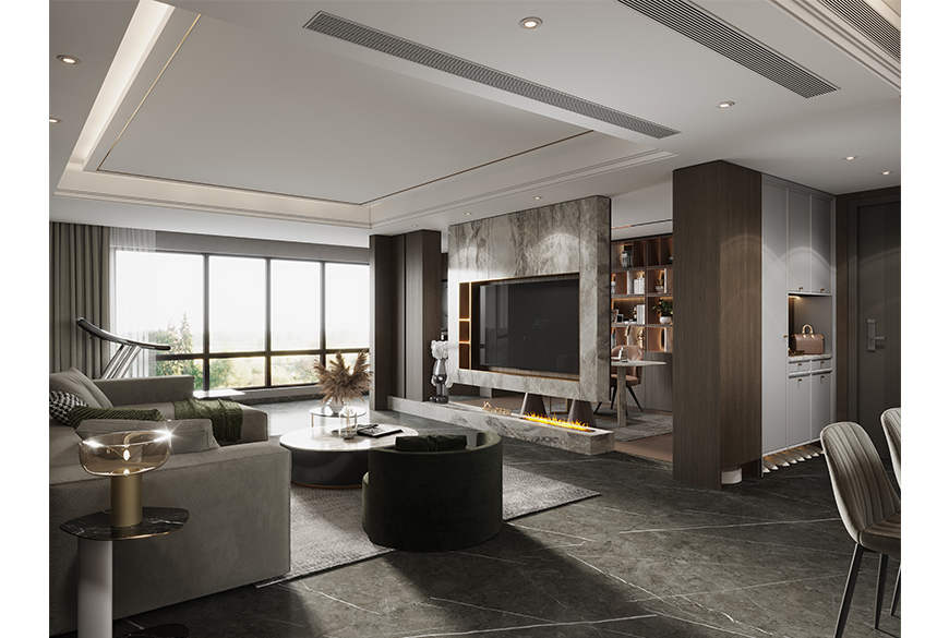 產(chǎn)品亮點(diǎn):客廳采用半開放式設(shè)計(jì)手法,增加視覺擴(kuò)張性與空間明亮感。電視柜采用懸空框架式結(jié)構(gòu),顏值與功能共存。金屬、巖板、木皮,碰撞出時(shí)尚、現(xiàn)代、高級(jí)的火花
