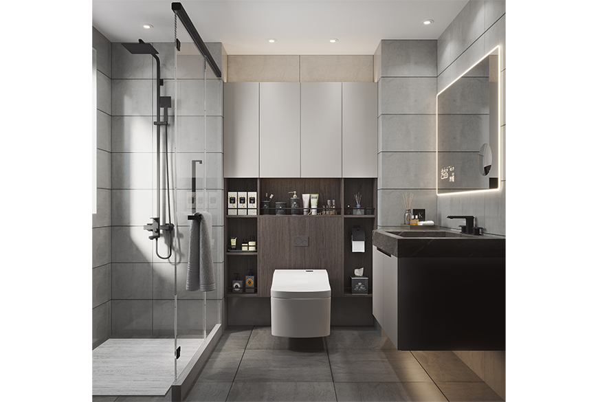 產(chǎn)品亮點(diǎn):主衛(wèi)完美解決墻體一邊深度不夠的戶型缺陷,采用倒角開(kāi)放柜設(shè)計(jì),馬桶與柜體之間預(yù)留出足夠的操作空間,物品存放拿取方便快捷